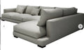 This modern and luxurious deep white corner sofa comfortably seats up to 6 people, making it perfect for spacious living rooms and stylish family spaces. It features a contemporary silhouette with plush, supportive cushions and a sturdy solid Marandi wood frame that rests on a continuous tubular metal base paired with elegant wooden legs.