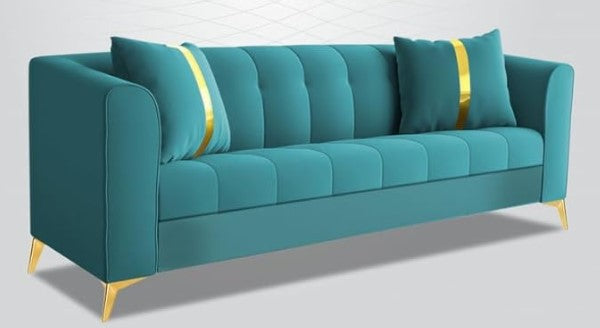 Enhance your living room with this modern Aqua Blue 3-Seater Sofa, designed with premium materials and long-lasting comfort. Made with a strong wooden frame (Sal, Kapur, Marandi) and upholstered in luxurious Velvet Suede Fabric, it offers a refined look and a medium-firm seating experience supported by 40-density HR foam and zigzag spring suspension for extra strength and bounce.