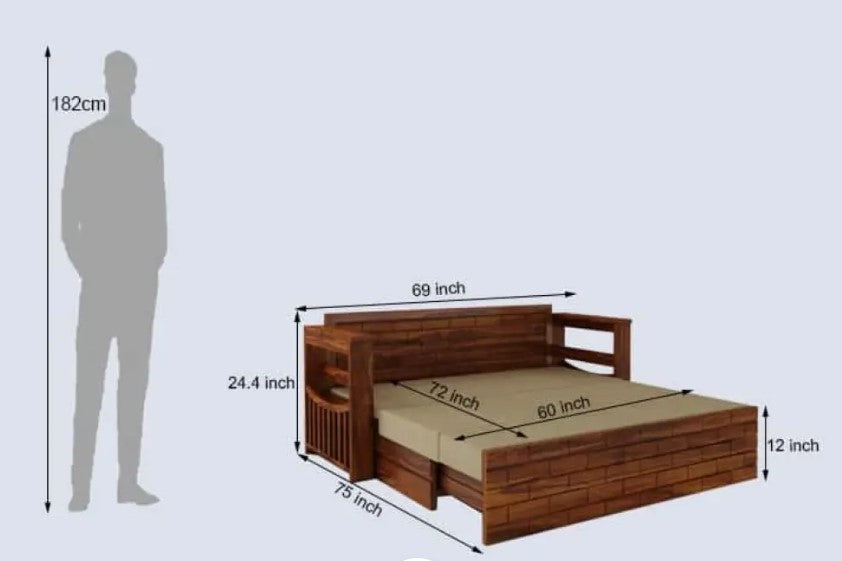 The Harmony Solid Sheesham Wood 3-Seater Sofa Cum Bed by LivIn Styles is a perfect blend of elegance, durability, and multifunctionality. Crafted from 100% solid Sheesham wood, this sofa cum bed offers exceptional strength and natural beauty, making it a timeless addition to any home. Designed with comfort in mind, it features a supportive headboard and a convenient mini storage compartment, ideal for keeping essentials within reach. During the day, it serves as a spacious 3-seater sofa measuring 60" × 28", providing ample seating for family and guests. By night, it effortlessly converts into a cozy bed measuring 60" × 72", making it an excellent choice for compact living spaces or guest rooms. Basic assembly is required, with all necessary hardware tools included in the package. Please note, accessories shown in images are for representation only and are not included.